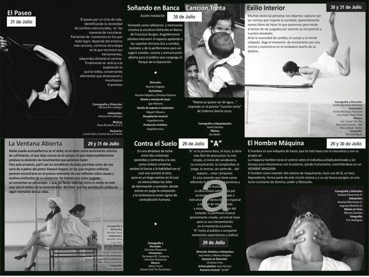 Dirigido por Jackie Quino Espectáculo de danza contemporánea combinando canto, musical tradicional y teatro. Funciones en : Encuentro de coreógrafos en el Icpna de Miraflores.(Ver más) Temporada en auditorios del teatro Británico, Universidad Tecnológica del Sur.